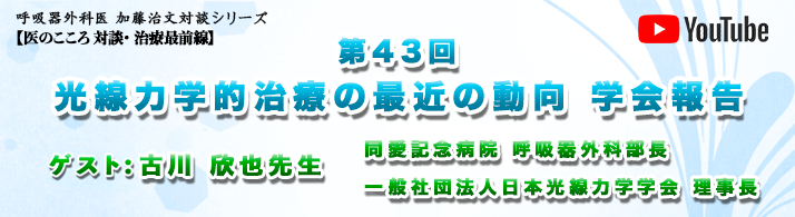 第43回 光線力学的治療の最近の動向 学会報告(ゲスト:古川 欣也 先生 同愛記念病院 呼吸器外科部長、一般社団法人日本光線力学学会 理事長 ) 2026年2月3日 最終更新日時 : 2026年2月3日 siHIrldi48e 下記アンケート用URLより、皆様のご感想、ご意見をお寄せください。https://forms.gle/5nxsR2QvSBrdY4K49
